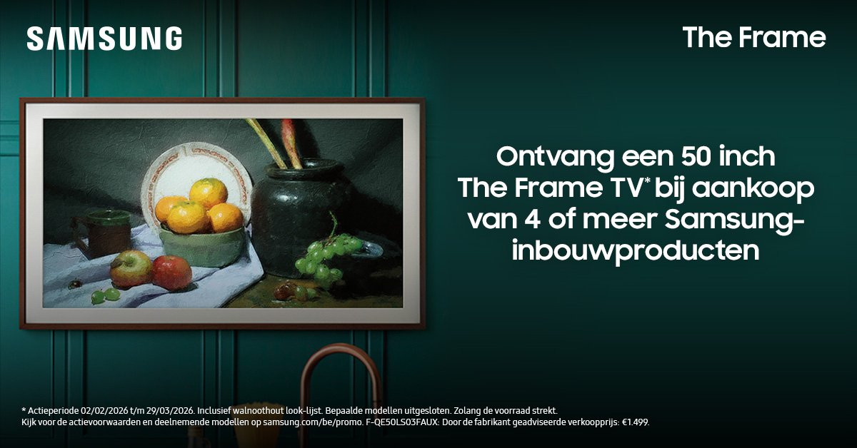 *Actieperiode: 02/02/2026 t.e.m. 29/03/2026. Inclusief walnoothout look-lijst. Bepaalde modellen uitgesloten. Zolang de voorraad strekt. Voor actievoorwaarden en deelnemende modellen, zie www.samsung.com/be/promo. F-QE50LS03FAUX: Door de fabrikant geadviseerde verkoopprijs: €1.499.